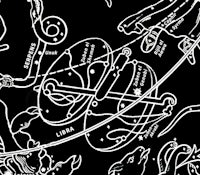 In Libra, the ecliptic passes through the lower side of the scales, while Scorpius' claws reach toward them from the west.