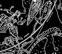 Attached to the tail of the fish are “Bands”, with the two ends meeting in a knot on the neck of Cetus, the Sea Monster. Its place is marked by the star, Al Risha, which in Arabic means, “the cords.” Across the Bands is the foreleg of Aries, the Ram.